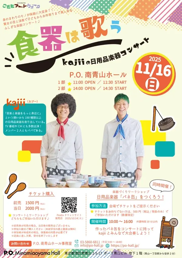 P.O.南青山ホールにて、青山のまちおこしプロジェクト『みなみあおやま こどもアートウォーク』(主催:株式会社ピーオーリアルエステート・ナチュラルスマイルジャパン株式会社)の一環として、『食器は歌う~kajiiの日用品楽器コンサート~』を2025年11月16日(日)に開催決定!