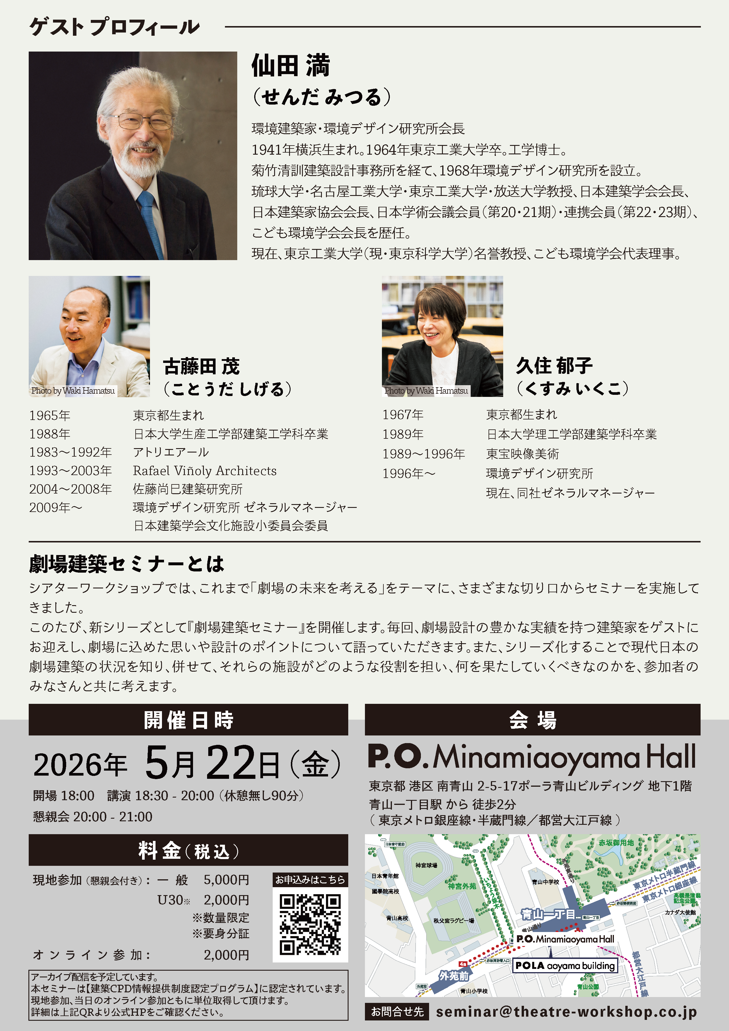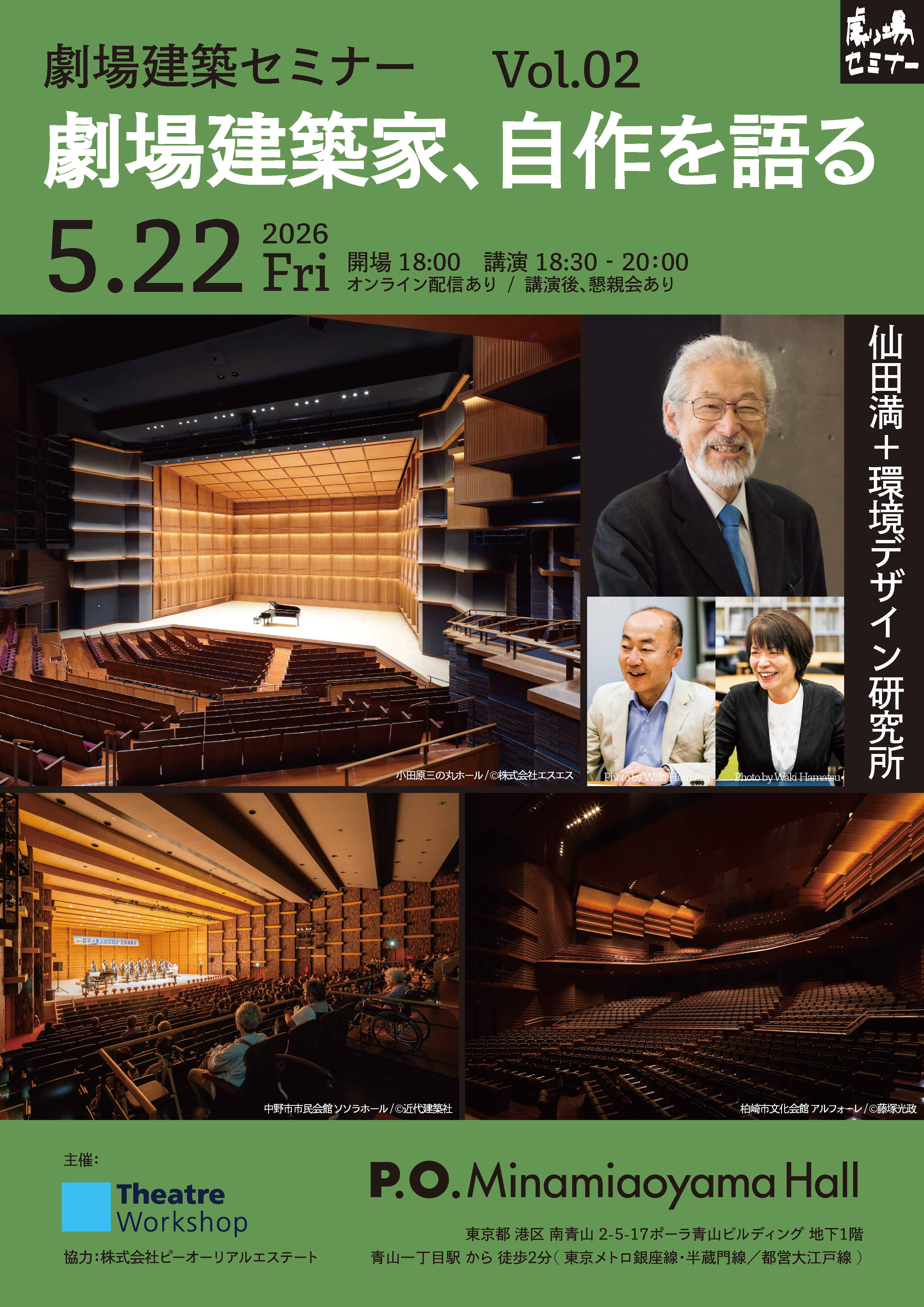 Vol.02は、2026年5月22日(金)、株式会社環境デザイン研究所の会長・仙田満氏、ゼネラルマネージャー・古藤田茂氏、ゼネラルマネージャー・久住郁子氏をお迎えし、これまで設計された小田原三の丸ホールなどをはじめとした作品について実例を紐解きながら、現代の劇場建築の担う役割や未来を、参加者のみなさんと共に考えます。